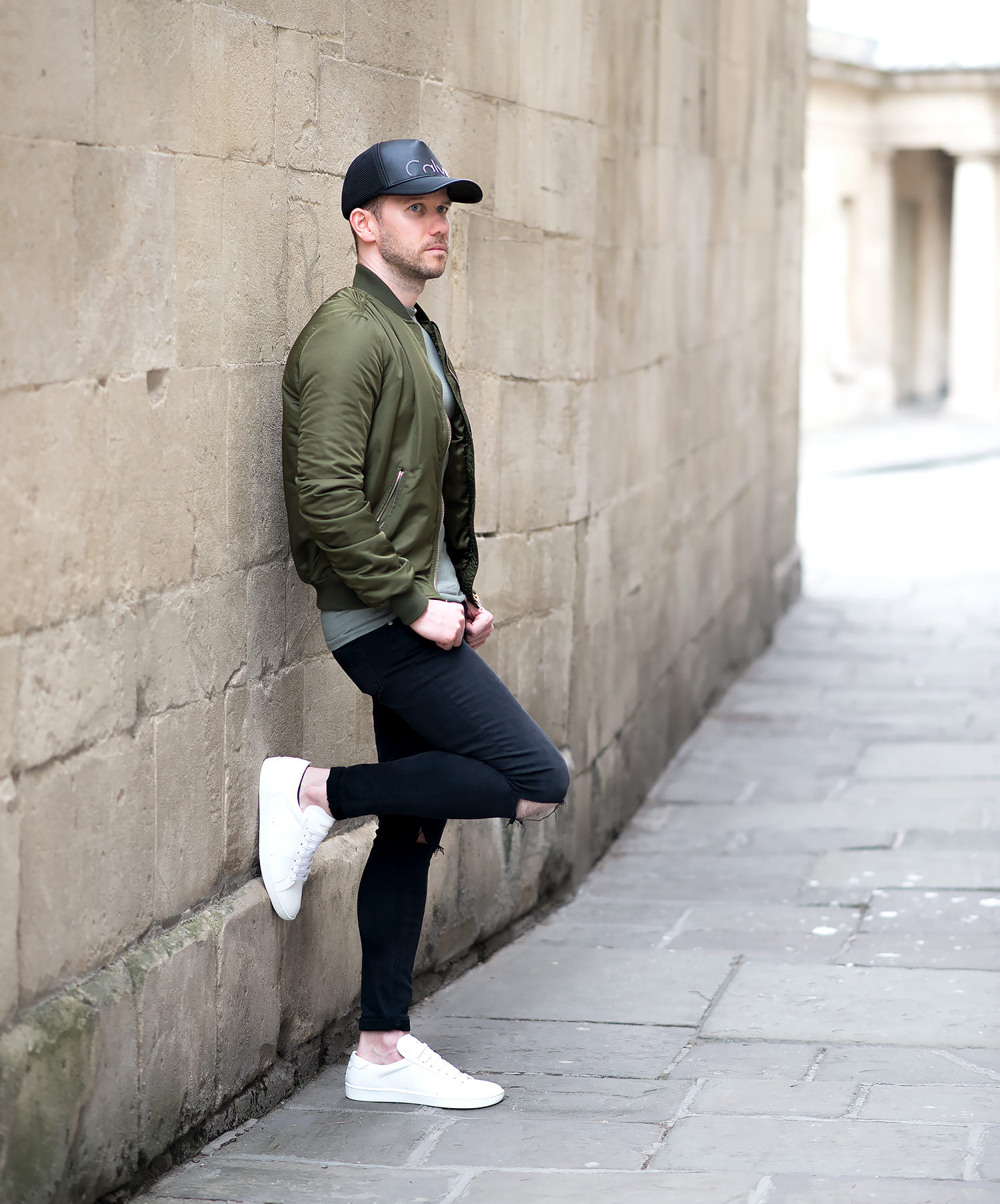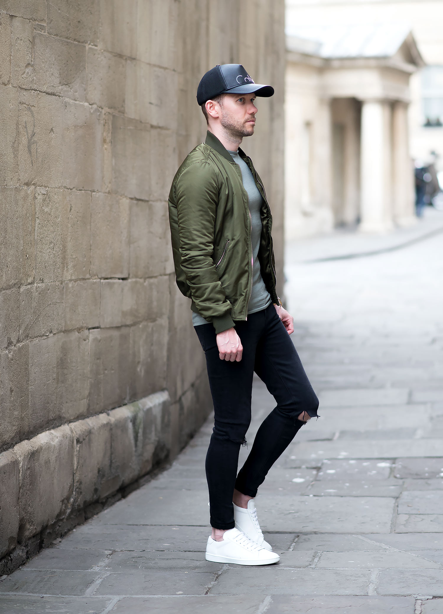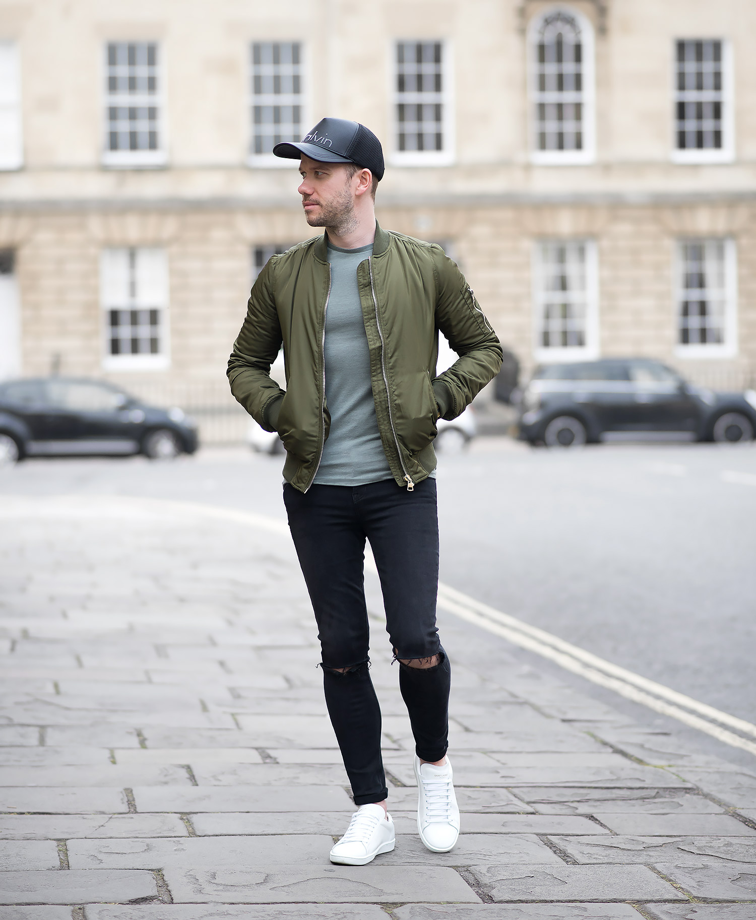 I complemented the jacket with an olive green ASOS T-Shirt which was in my wardrobe, as luck would have it, both colour tones gelled perfectly! My GRLFRND Candice Mid-Rise Super Stretch Skinny Jeans In Love Hangover were worn again! It’s testament to their quality, fit and comfort as to why they are my regular denim of choice! On my head I donned my Calvin Klein Trucker Baseball Cap, this is becoming one of my favourite accessory pieces I own (quite remarkable, considering I originally shunned away from any type of head wear, especially baseball caps!). Finally, I rounded off the outfit with my Saint Laurent Off White Court Classic Sneakers to give the ensemble that pop of contrasting brightness!
