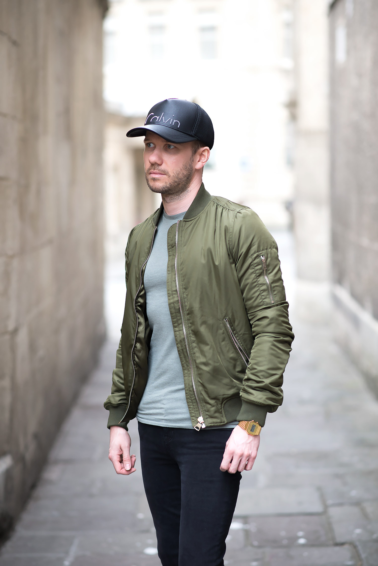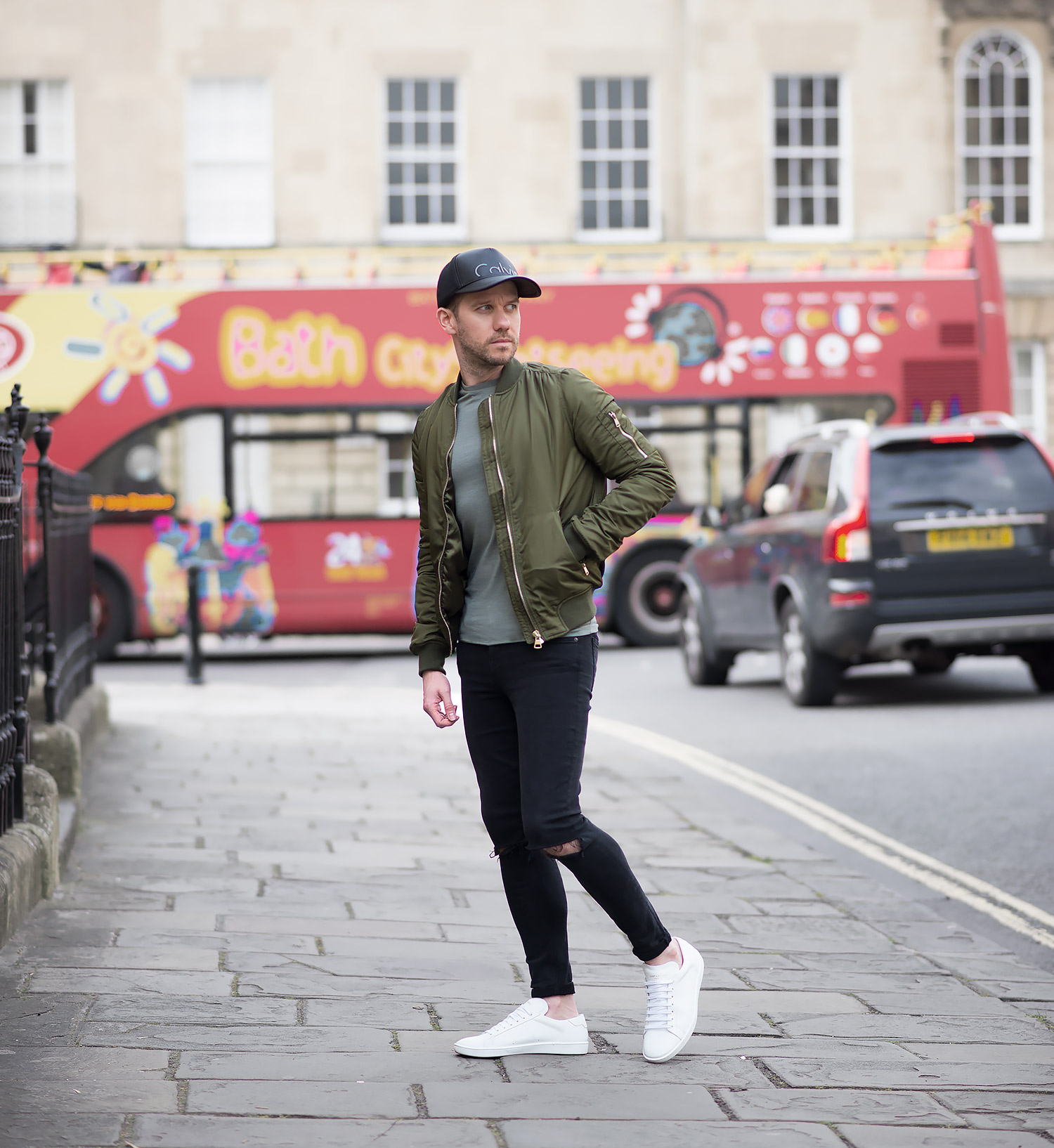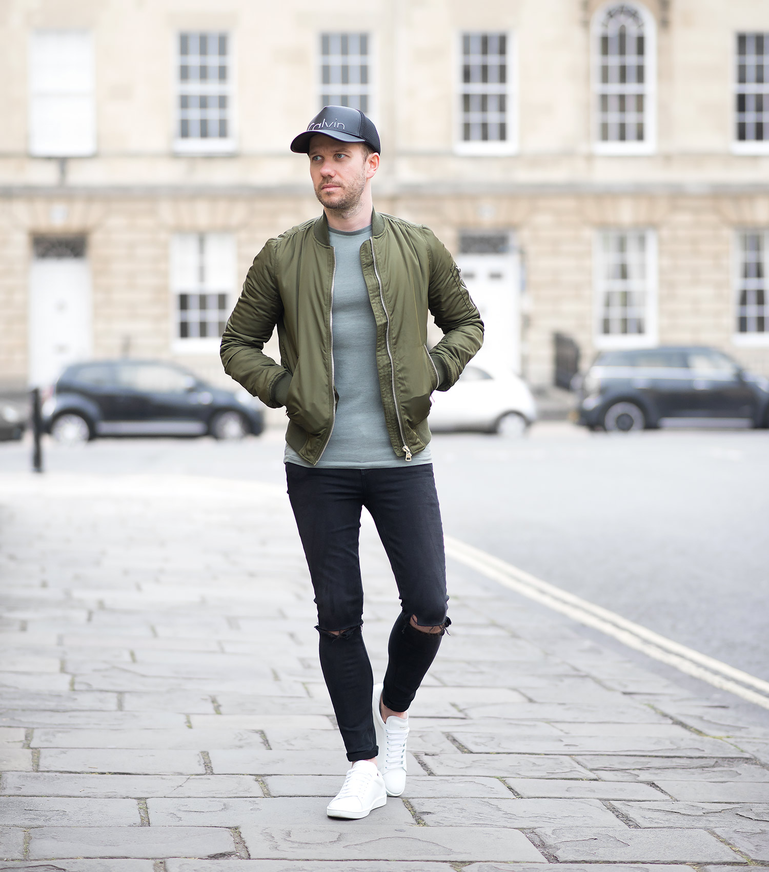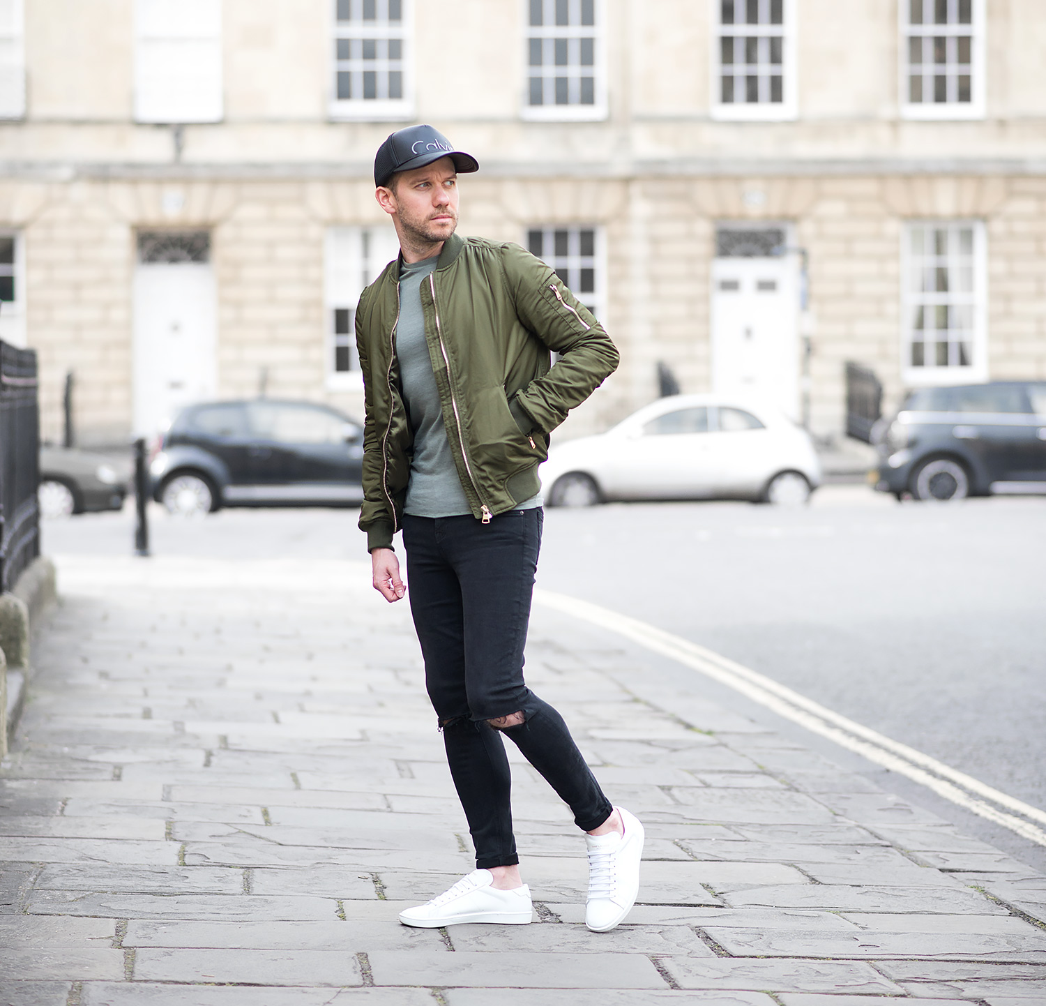 I complemented the jacket with an olive green ASOS T-Shirt which was in my wardrobe, as luck would have it, both colour tones gelled perfectly! My GRLFRND Candice Mid-Rise Super Stretch Skinny Jeans In Love Hangover were worn again! It’s testament to their quality, fit and comfort as to why they are my regular denim of choice! On my head I donned my Calvin Klein Trucker Baseball Cap, this is becoming one of my favourite accessory pieces I own (quite remarkable, considering I originally shunned away from any type of head wear, especially baseball caps!). Finally, I rounded off the outfit with my Saint Laurent Off White Court Classic Sneakers to give the ensemble that pop of contrasting brightness!