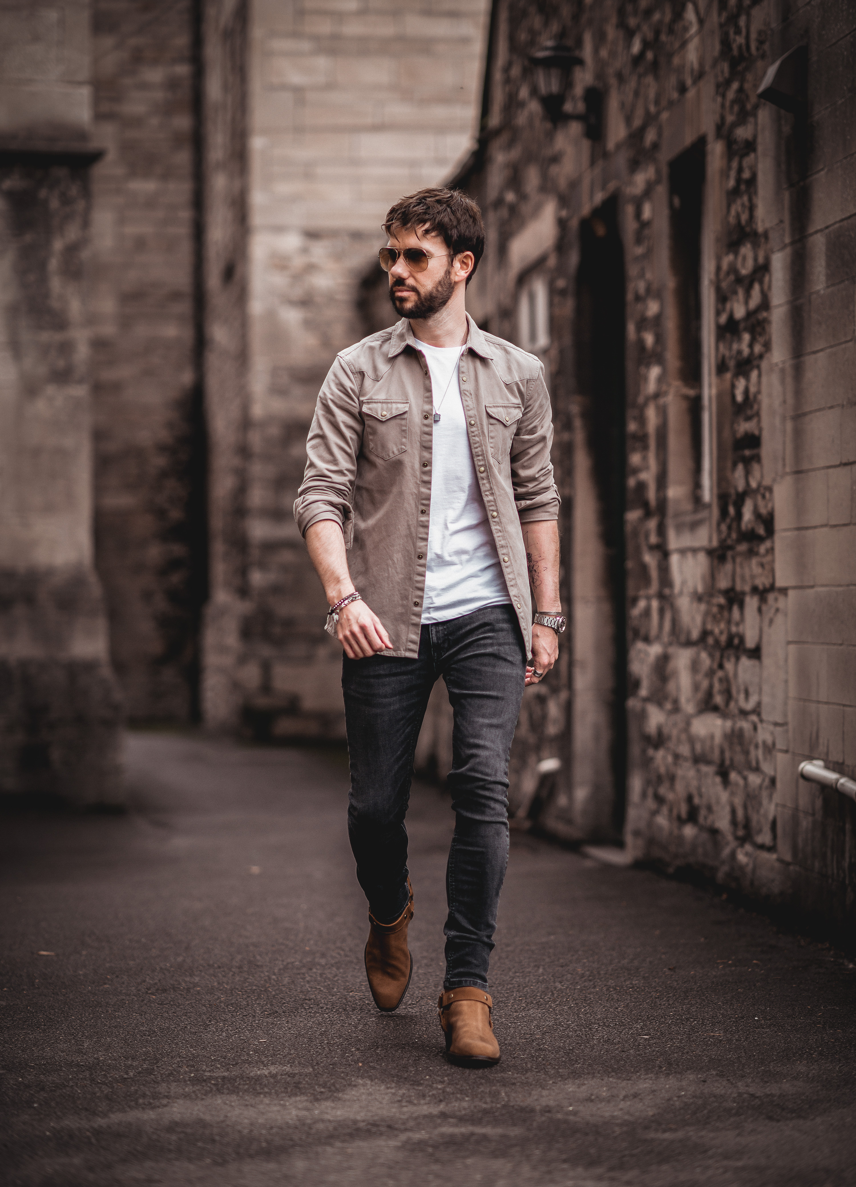 The get this look, I chose an AllSaints brown western shirt, worn with the sleeves rolled to eliminate the loose looking arms for an overall sleeker appearance. I wore the shirt open with a classic ASOS white T-shirt underneath to portray a more casual vibe. My choice of denim was my current new favourite – Nudie Jeans Skinny Lin in washed black, this slightly looser pair of jeans is a welcome addition to my wardrobe in contrast to my close-fitting women’s skinny jeans.