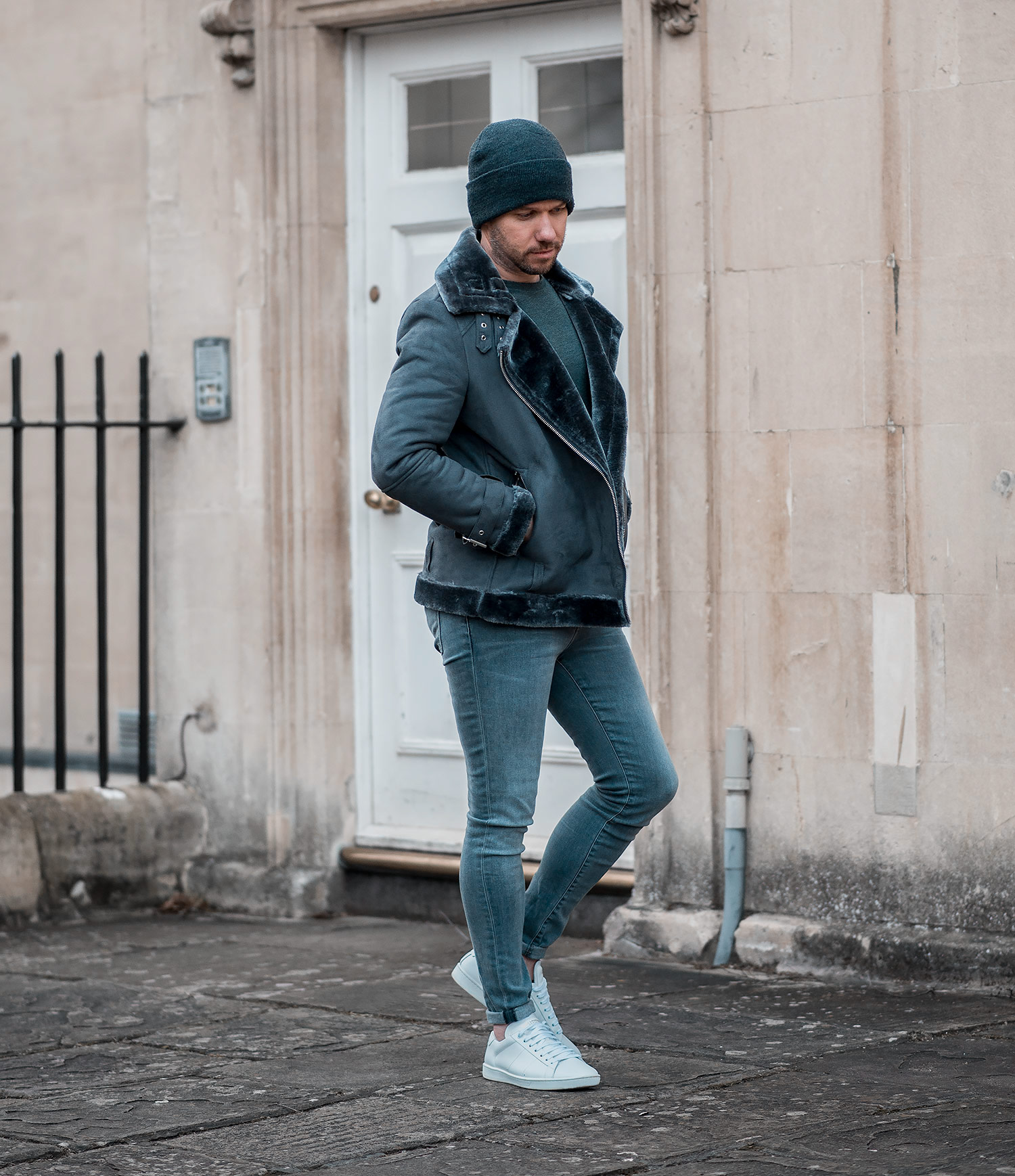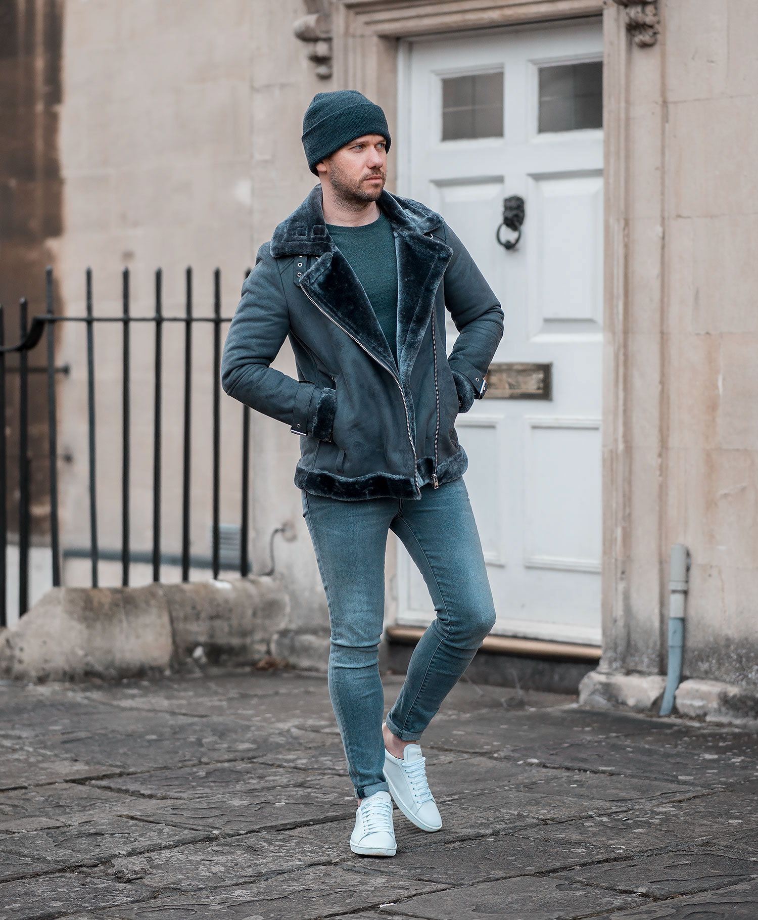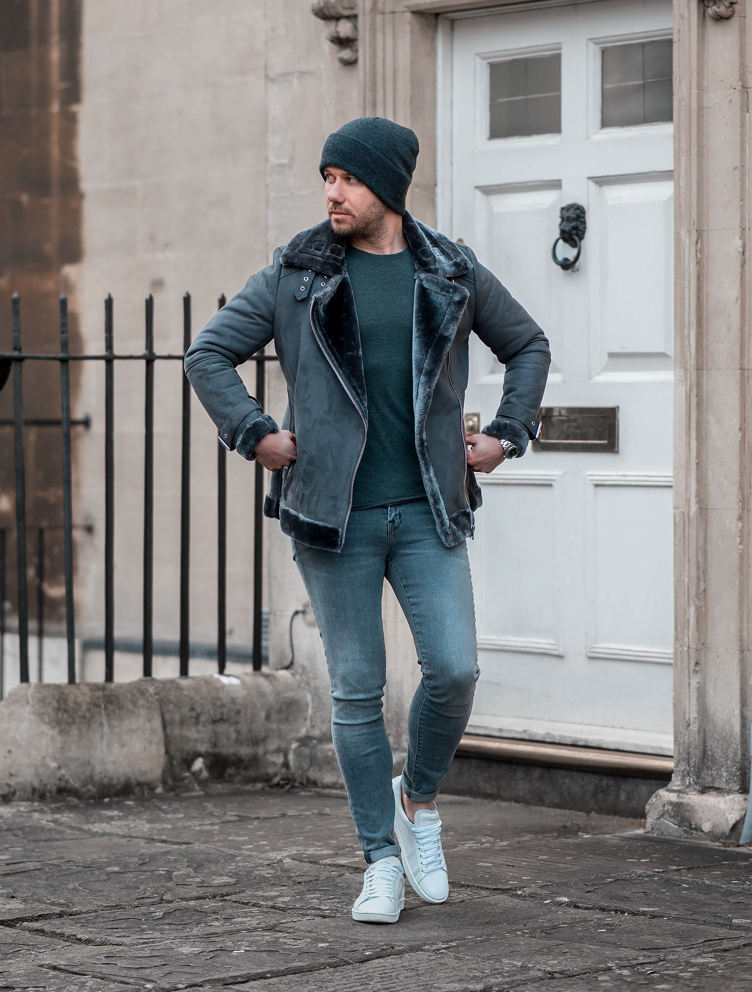 For my first outing wearing my new outerwear acquisition, I opted for a monochrome effect, choosing a selection of grey shades from my collection. My J Brand Maria Skinny Jeans in Dove paired with my Saint Laurent Court Classics White Sneakers were the obvious choice, both perfectly suited to the task at hand. Completing the look with a dark charcoal beanie hat, helping to keep that winter breeze at bay.